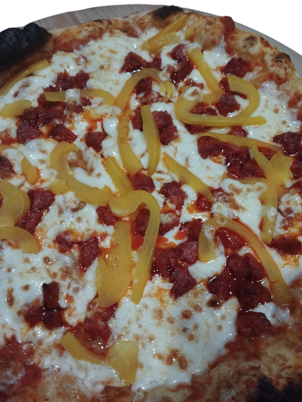 Composition : sauce tomate cuisinée, mozzarella, poivrons, chorizo.