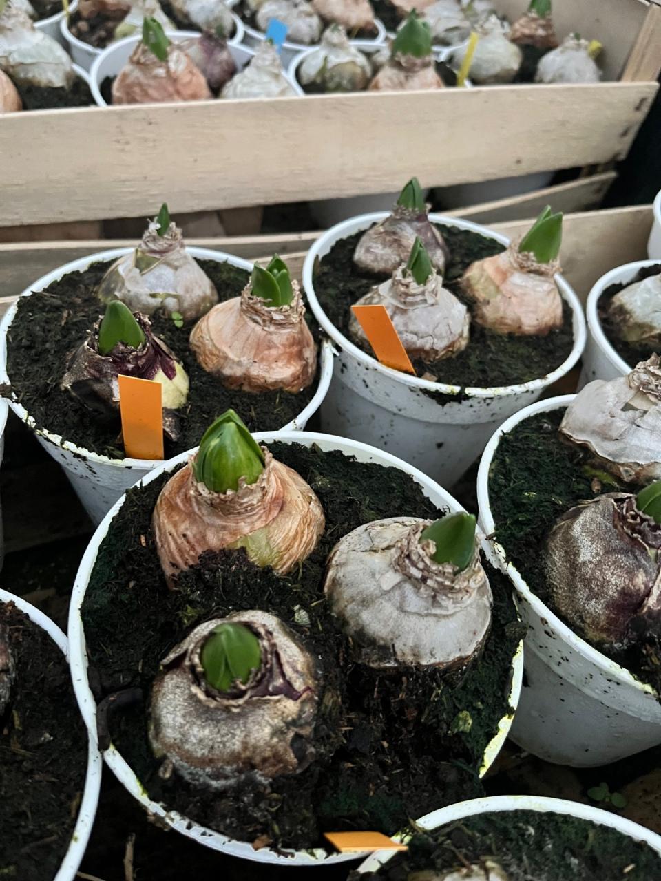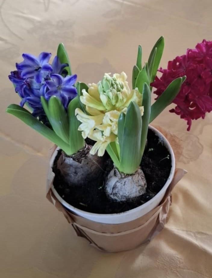 Je propose des jacinthes en pot de 1 Litre, 3 bulbes de 3 couleurs différentes.