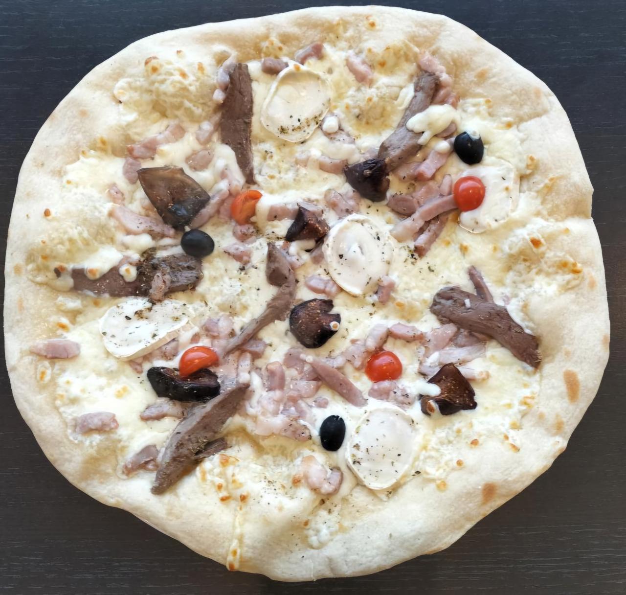 Ingrédients : Sauce tomate, basilic, mozzarella, magret de canard, chèvre, lardons, figues.