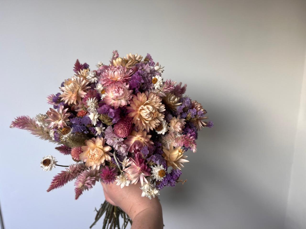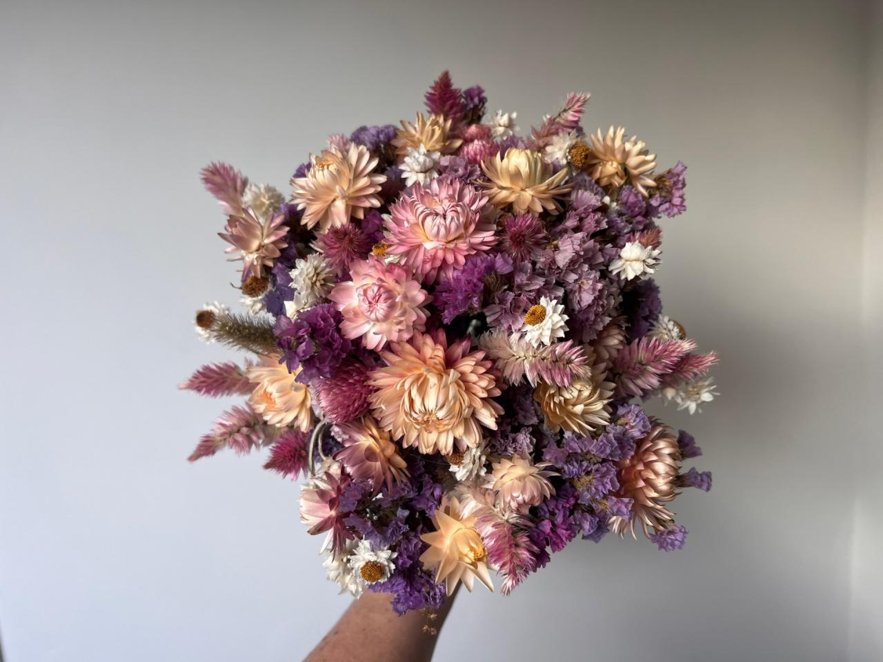 Chaque bouquet est composé de variétés spécialement choisies pour le séchage : statice, gomphrena, célosie, ammobium et immortelle.
