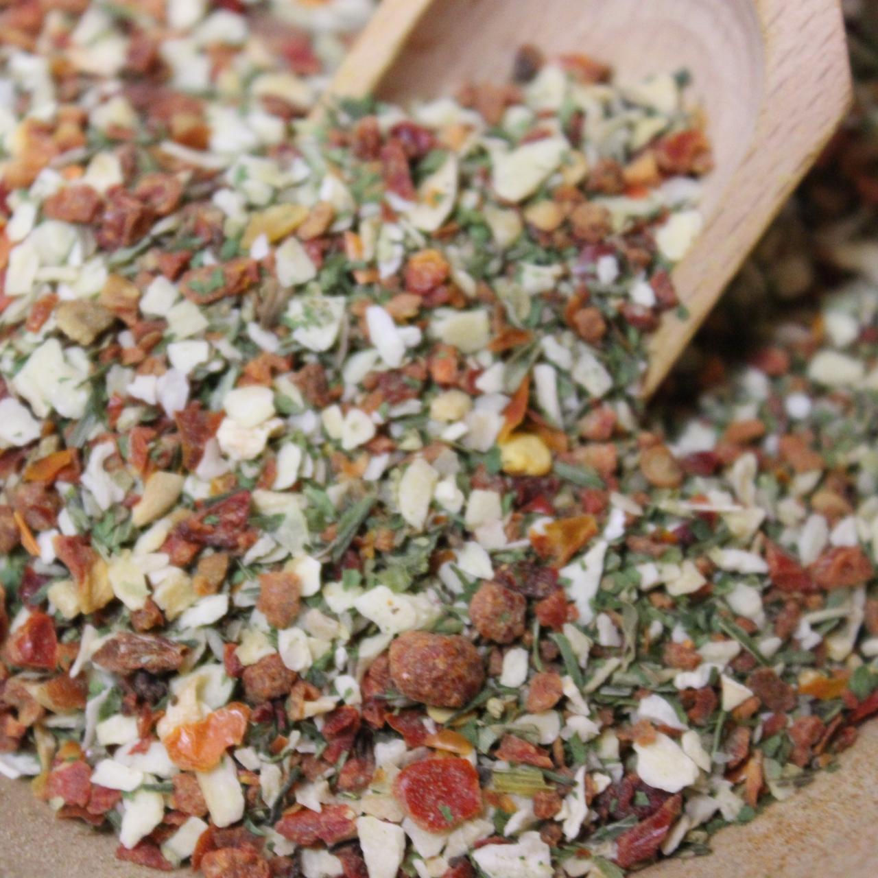 Ingrédients : Tomates*, poivrons*, ail*, oignon*, persil*, ciboulette*, Fleur de Sel, basilic*, origan*, piment*, thym*