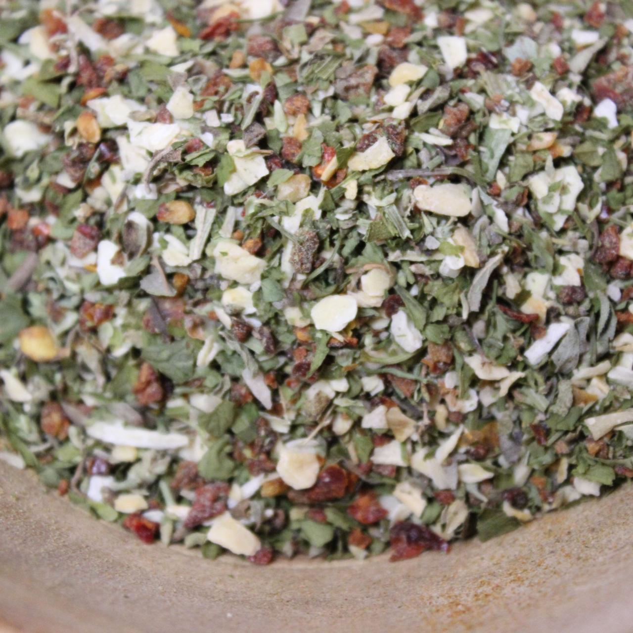 Ingrédients : Poivrons*, ail*, oignon*, tomate*, poivron*, fleur de sel, origan*, persil*, ciboulette*