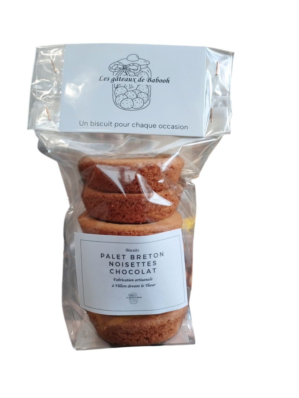 Allergènes : Beurre, Œufs, Farine Conditionnement : Sachet Durée de conservation : 2 mois Ingrédients : Jaune d'œuf, farine de blé, beurre demi-sel, sucre, levure chimique, sel, chocolat, noisettes. Colorants ou arômes : Sans