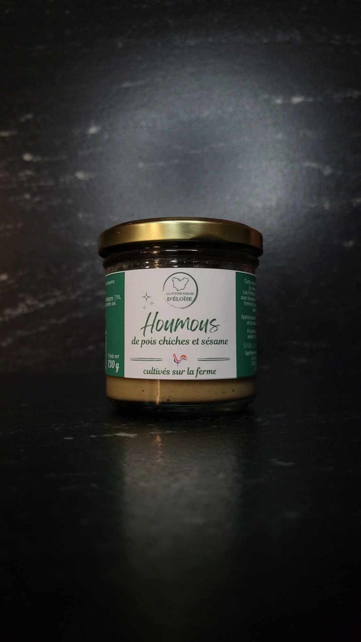 Houmous de pois chiches cuisinée par la conserverie normande Les Petites L'Ouches à Bernay avec les pois chiches cultivés sur ma ferme et une généreuse dose de purée de sésame. Nos pois chiches sont non OGM, produites en agriculture intégrée, ce qui se traduit par une baisse de 50% d’utilisation de produits phytosanitaires. Et surtout garanties sans traitement chimique post récolte.