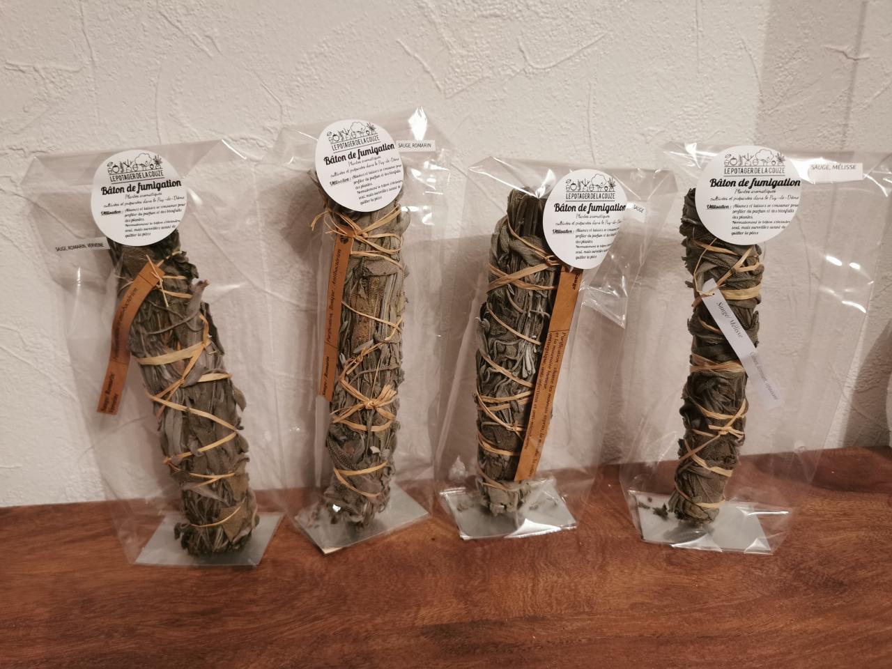 Bâton de fumigation aux plantes aromatiques cultivées et séchées artisanalement à Saint-Floret.