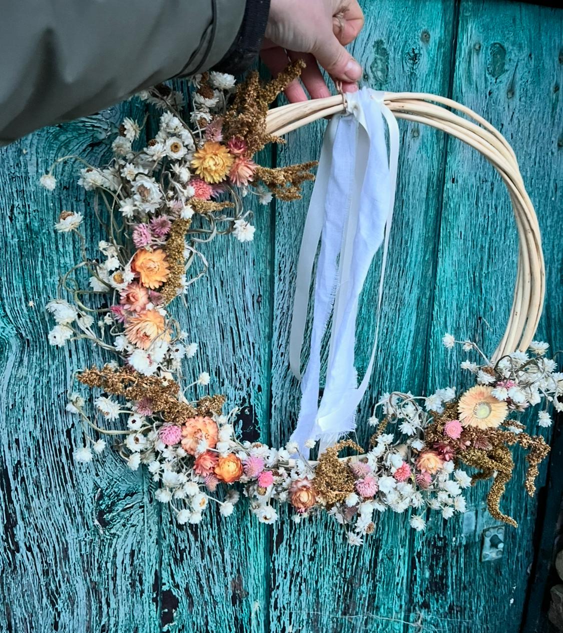 Une couronne composée de différentes variétés spécifiques au séchage : statice, gomphrena, acroclinium, ammobium, etc.