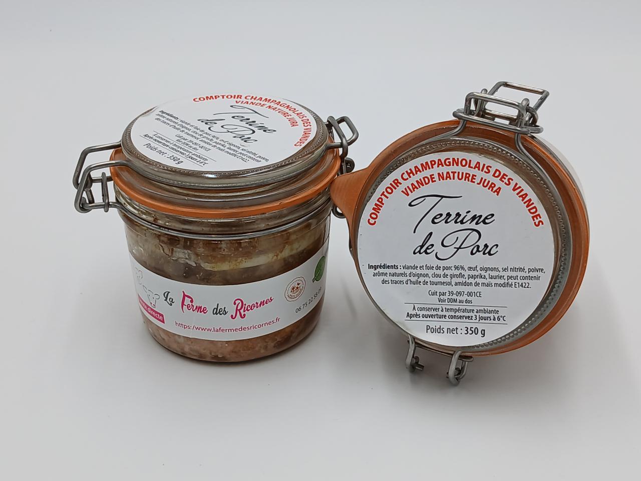 La Ferme des Ricornes vous propose une terrine pur porc aux champignons en bocal d'environ 350 g.