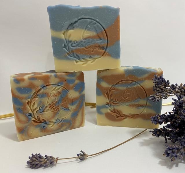 🐐 Composé de lait de chèvre, de beurres et huiles végétales biologiques, enrichi d’argile rose et d’huile essentielle de lavandin grosso également biologiques, parsemé d’oxyde minéral bleu.