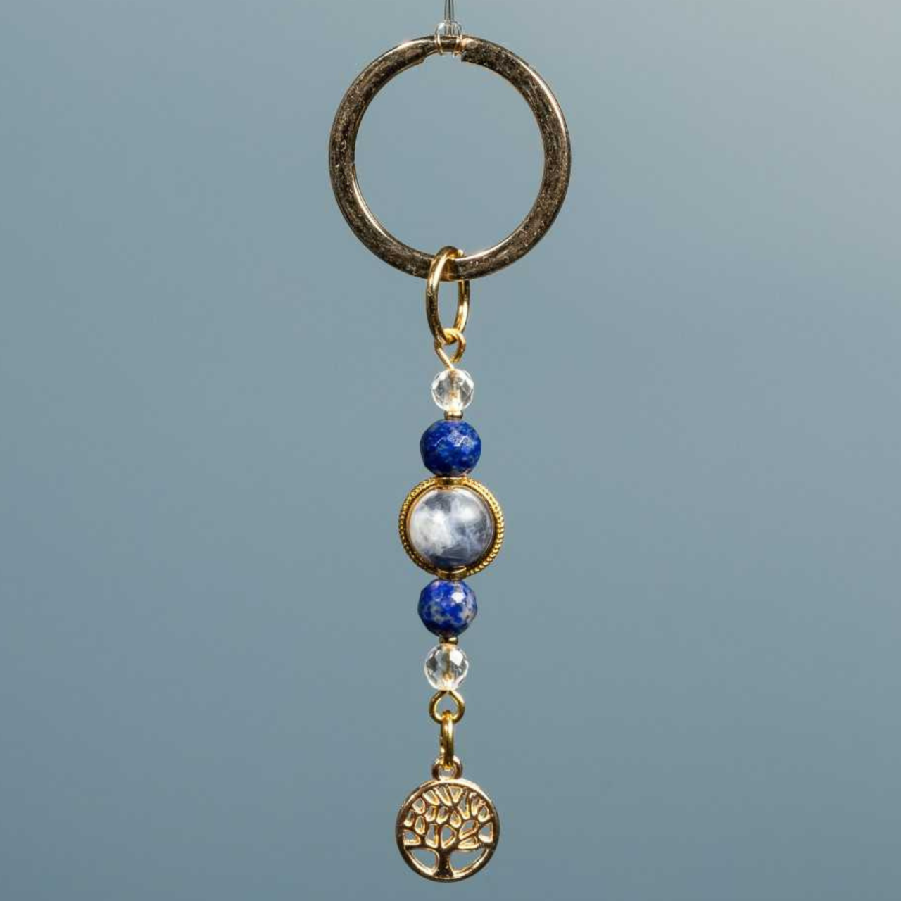 Fabriqué à la main, ce petit porte clé en métal doré est agrémenté de pierres naturelles : lapis lazuli, sodalite et cristal de roche, de perles dorées et d’un arbre de vie.