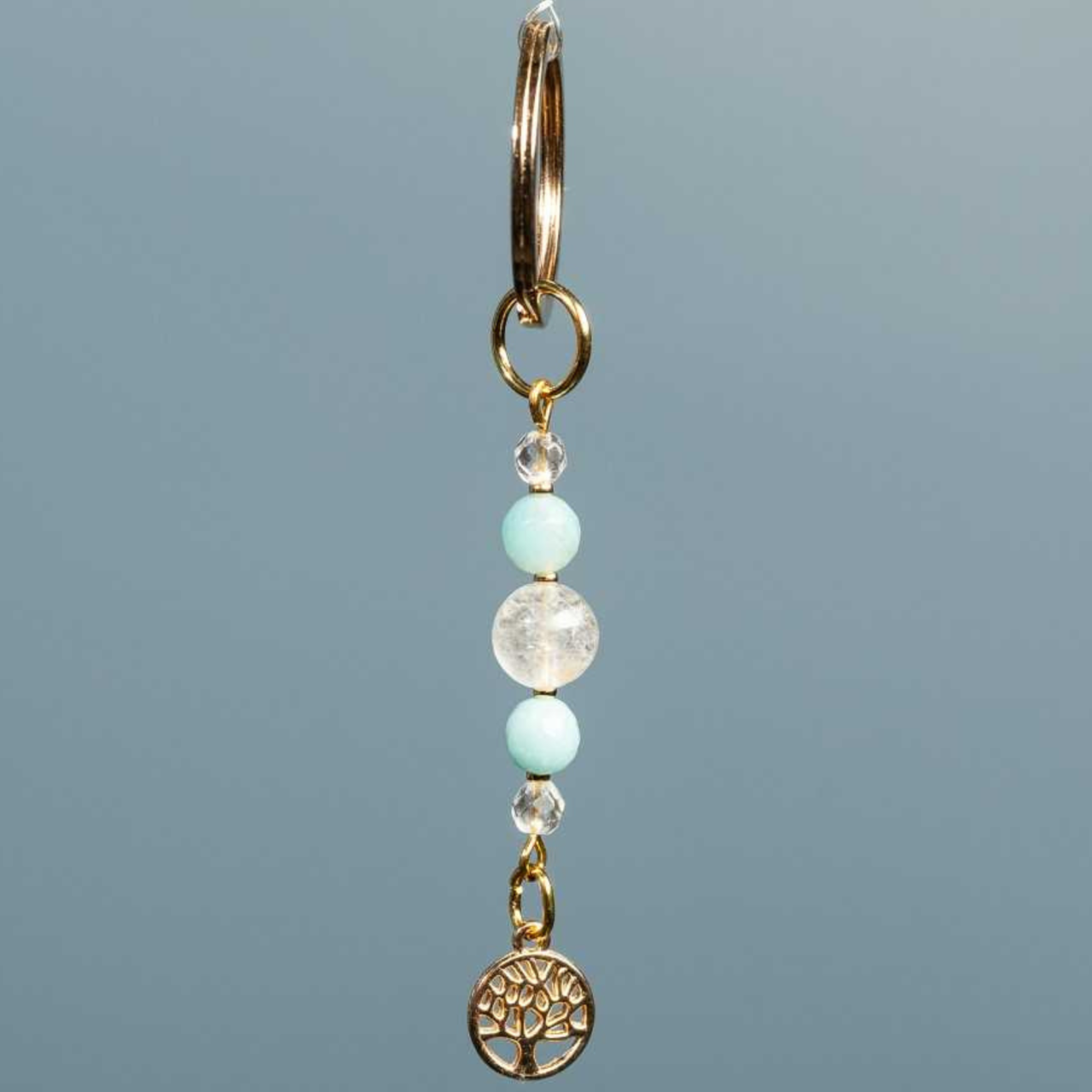 Fabriqué à la main, ce petit porte clé en métal doré est agrémenté de pierres naturelles : aigue marine et cristal de roche, de perles dorées et d’un arbre de vie.