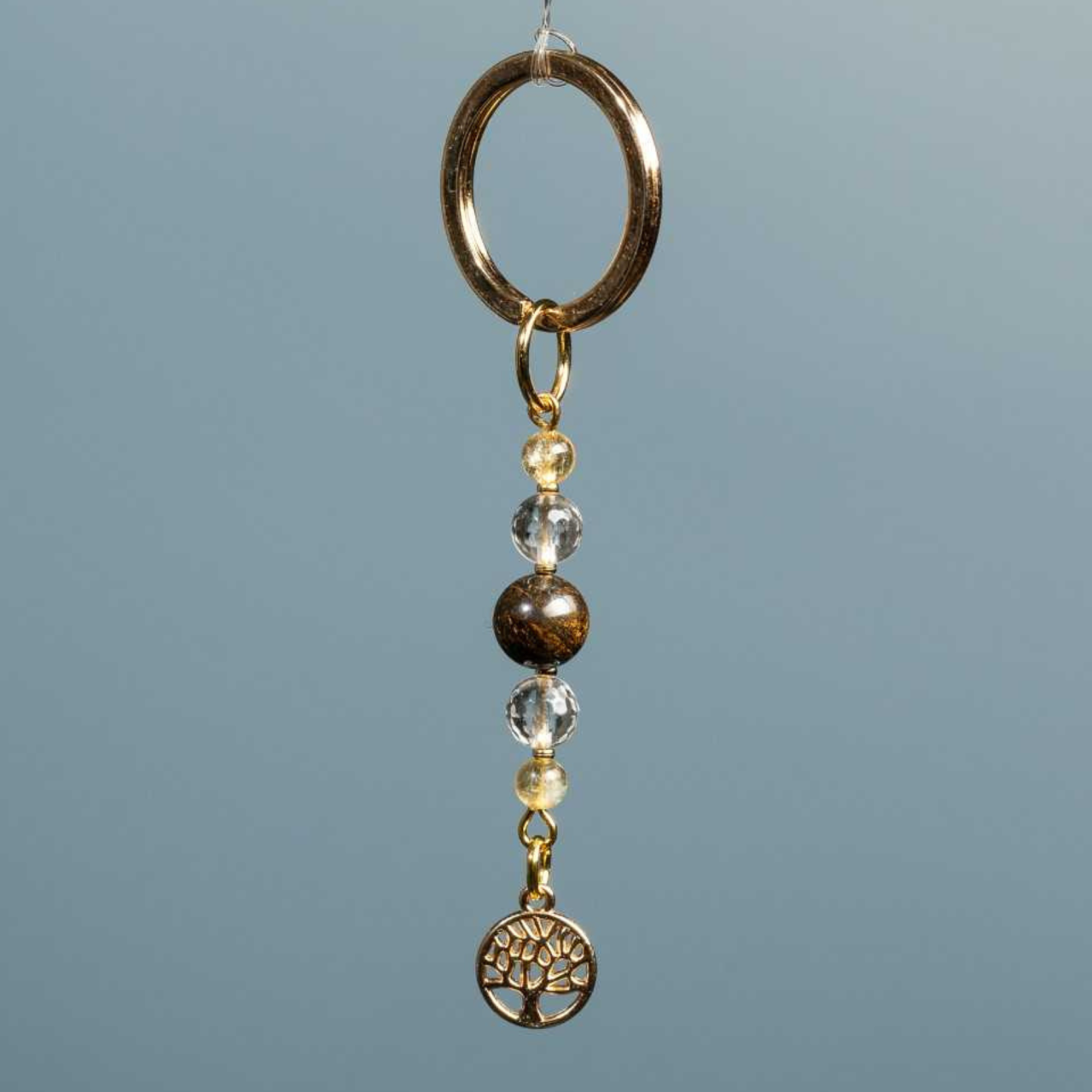 Fabriqué à la main, ce petit porte clé en métal doré est agrémenté de pierres naturelles : bronzite, citrine, cristal de roche, de perles dorées et d’un arbre de vie.