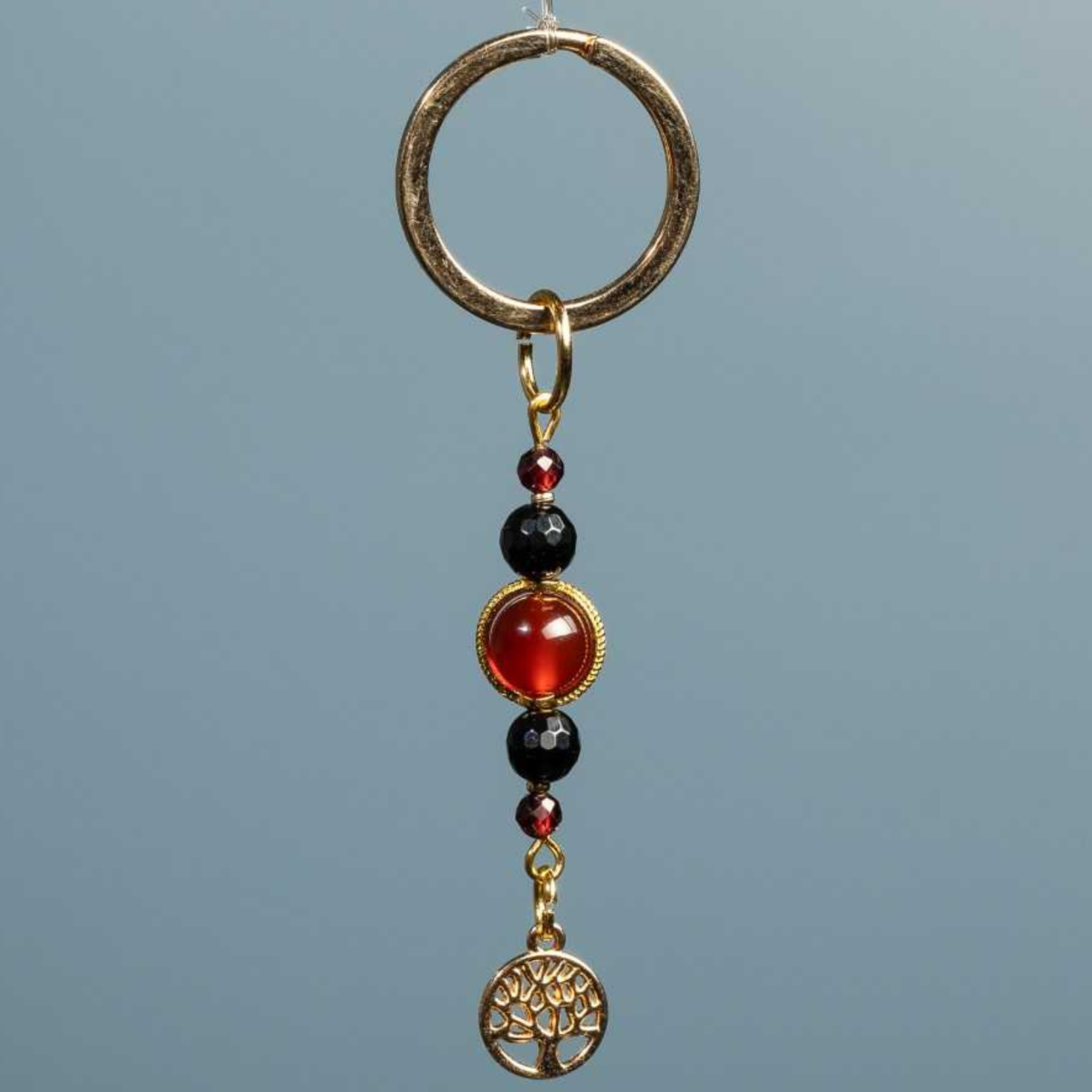 Fabriqué à la main, ce petit porte clé en métal doré est agrémenté de pierres naturelles : agathe rouge, onyx et grenat, de perles dorées et d’un arbre de vie.