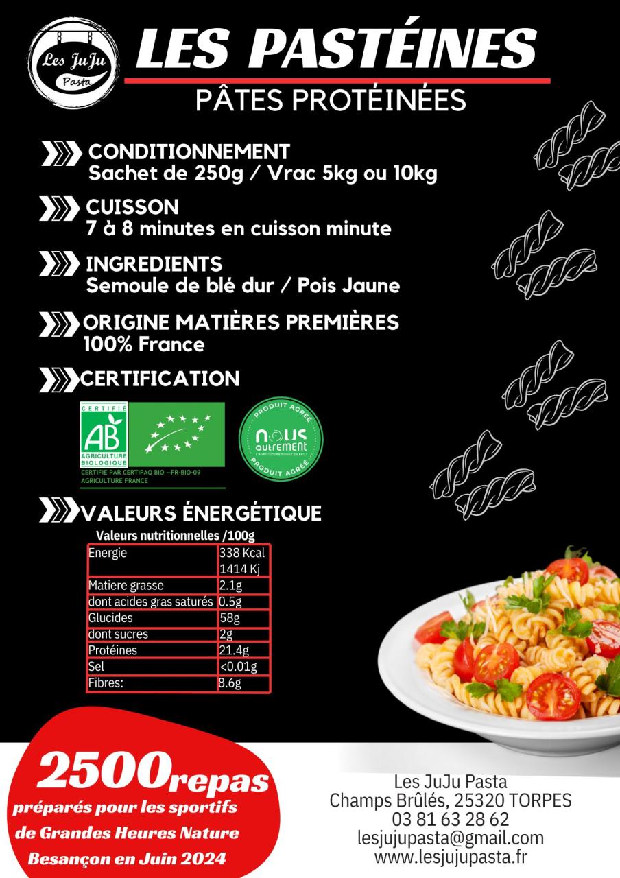 Fruit d'une collaboration depuis plus de 3 ans entre Les JuJu Pasta (artisans pastiers à Torpes) et Gérard Mignot (dr en biochimie-agroalimentaire à Saône) pour la création des Pastéines, notre nouvelle gamme de pâtes protéinées.