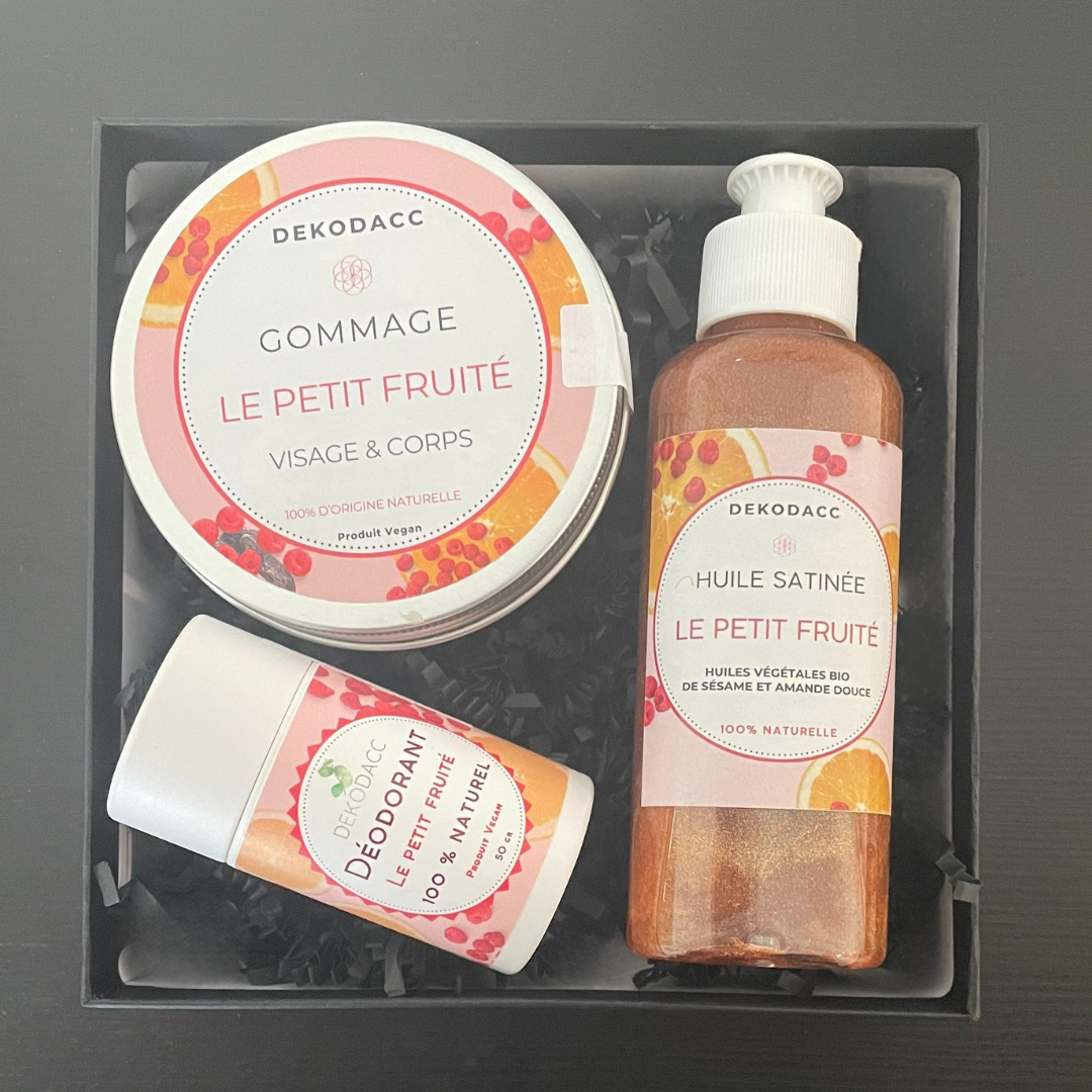 Vous y retrouverez le gommage petit fruité et serez surpris par sa rinçabilité et sa douceur ! Le déodorant stick fruité vous surprendra par son efficacité, et l’huile satinée apportera une touche de paillète et une sublime odeur sur votre peau.