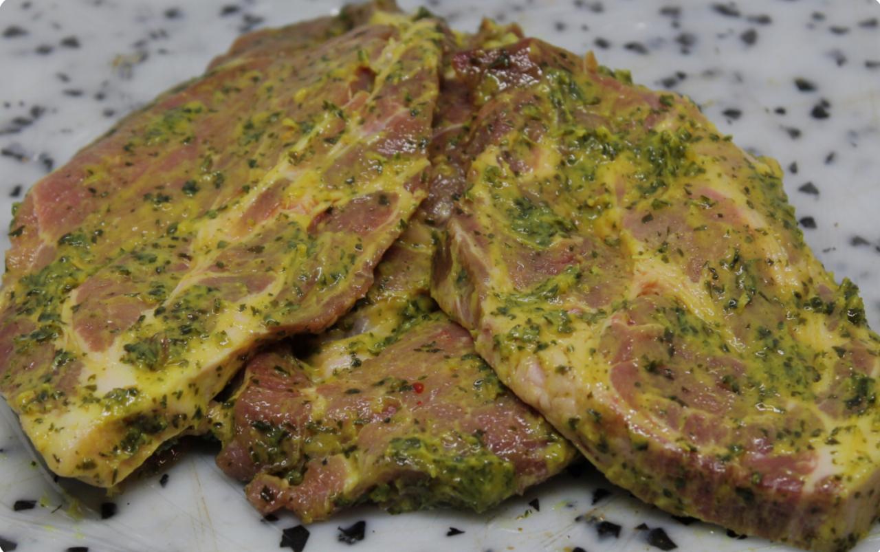 Côtes de porc, marinade ail des ours, gascon, dans le filet ou dans l’échine, marinées et conditionnées par 2.