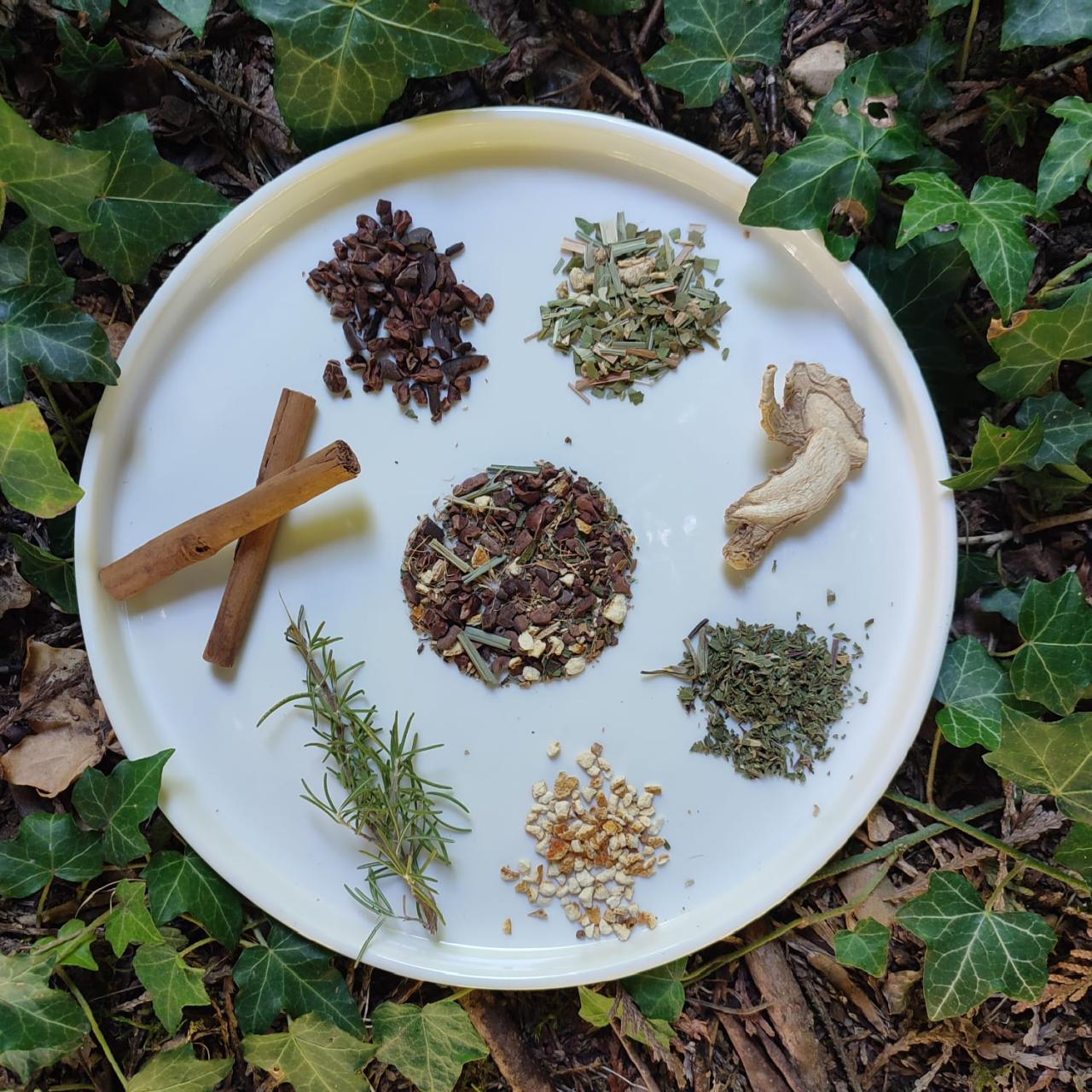 Ingrédients : éclats de fèves de cacao* torréfiées (79%), feuilles de maté (5%), feuilles de romarin (4%), écorces d’orange (3%), feuilles de menthe poivrée (3%), racines de gingembre (2%), écorces de cannelle (2%), parties aériennes de la citronnelle (2%).