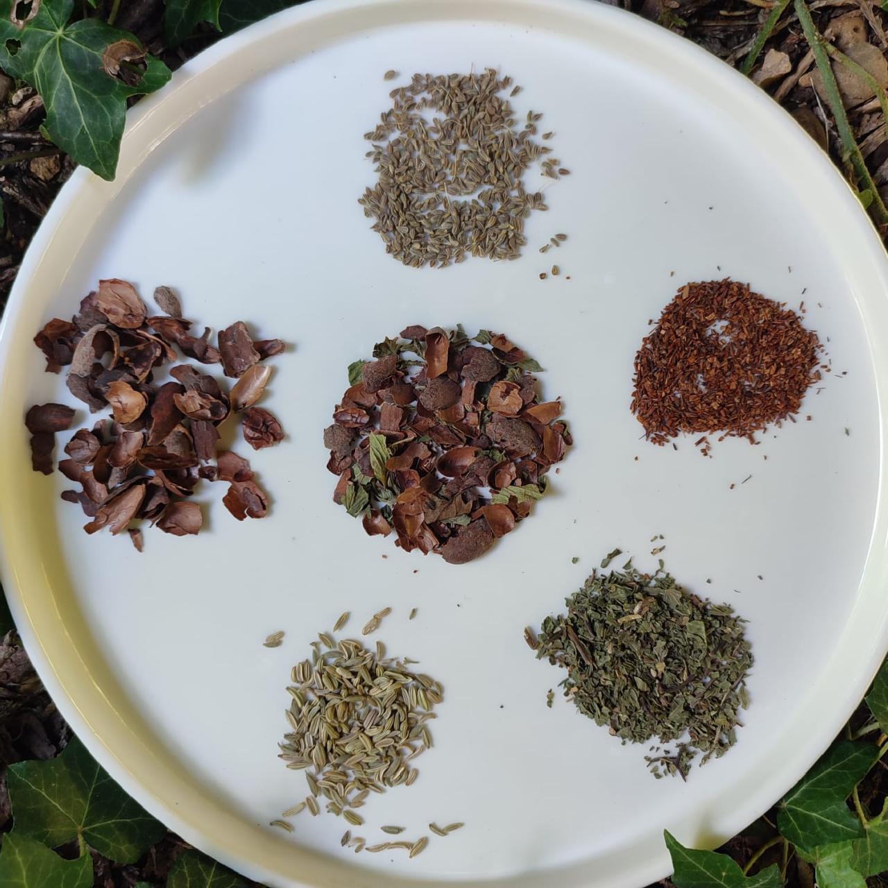 Ingrédients : écorces de fèves de cacao* torréfiées (67%), graines d’anis vert (10%), graines de fenouil (10%), feuilles de menthe poivrée (7%), parties aériennes du rooibos (6%).