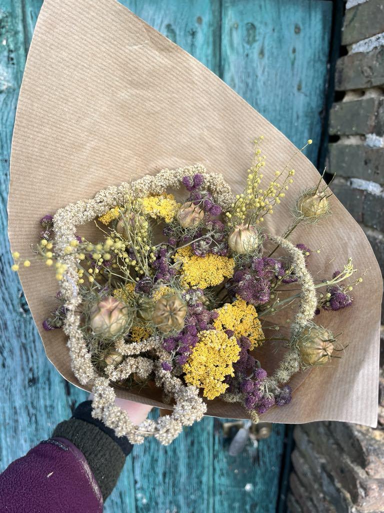 Je propose mes fleurs séchées soigneusement à l'été 2024 dans le grenier au-dessus de mon atelier.