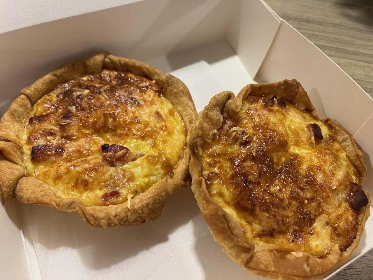 composée d'une pâte brisée maison cuite à blanc, lardons grillés, emmental râpé, appareil à quiche