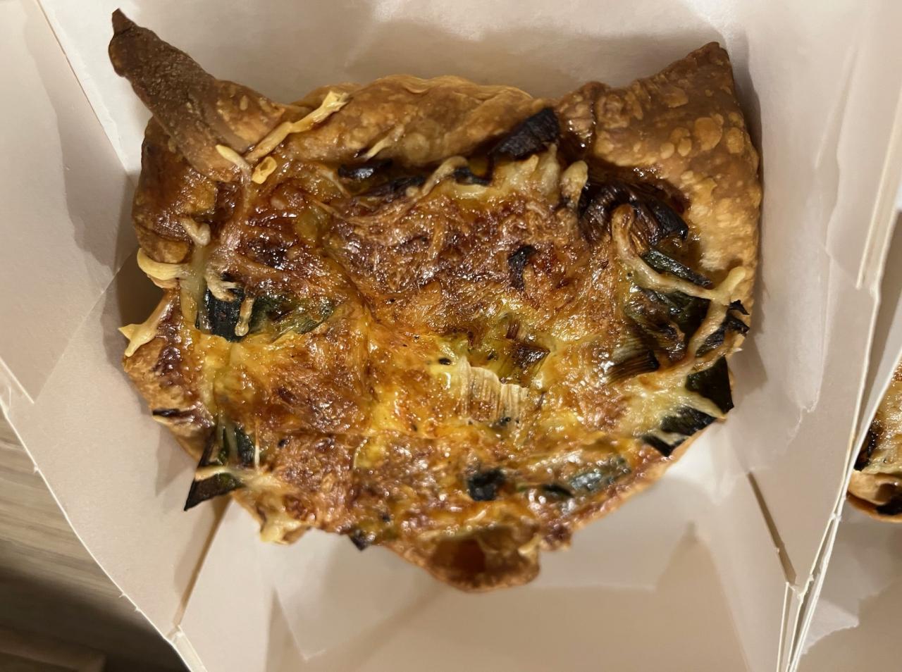 composée d'une pâte brisée maison cuite à blanc, poireaux revenus, de l'emmental râpé, appareil à quiche.