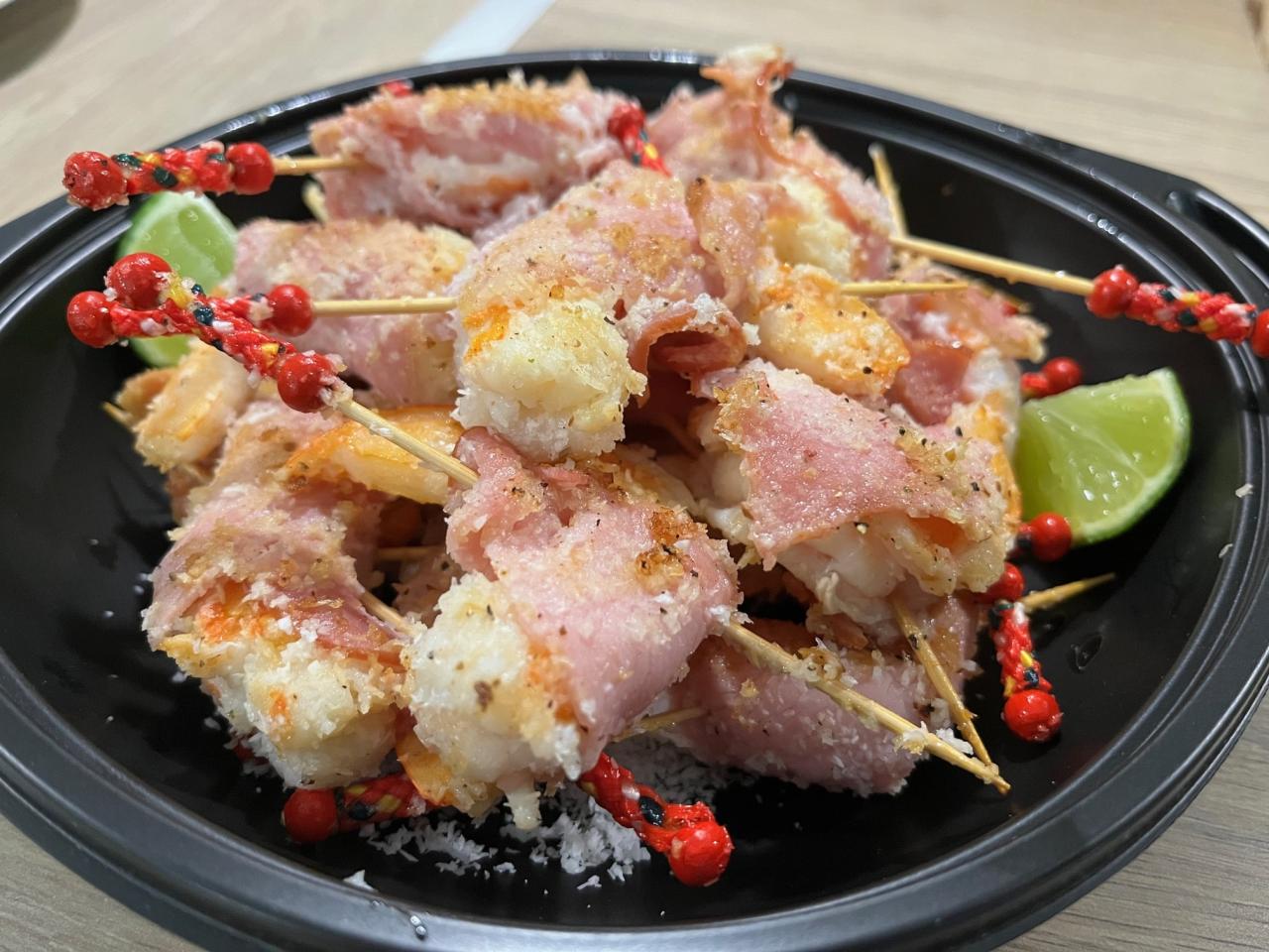 Crevettes décortiquées et châtrées habillées de bacon et saupoudrées de noix de coco.