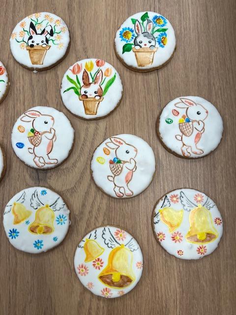 Biscuits sablés aux amandes avec un glaçage royal blanc sur lequel Maud a dessiné.