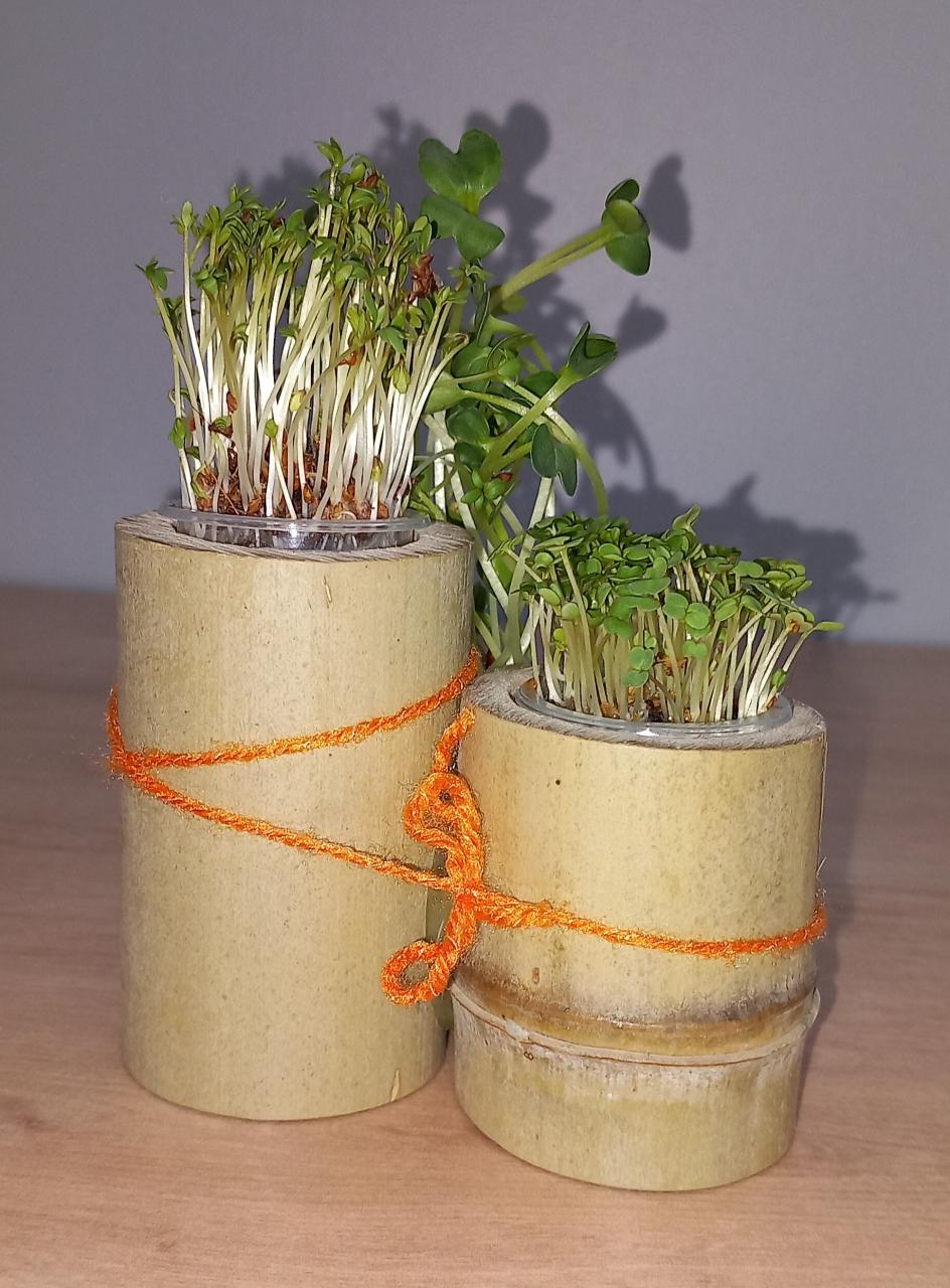 Conditionnement : Sur substrat, dans petits pots et décor en bambou brut
