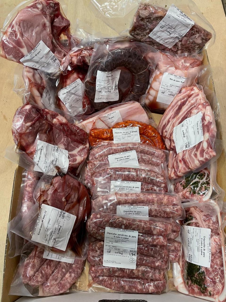 - colis de 10 KG : 1 Rôti filet / 1 Rôti dans la noix ou rouelle / 1 Palette avec os ou Jarret/ Sauté de Porc / 1 Escalope / Travers à griller / 4 Côtes premières/ 4 Côtes échine / Poitrine / Pâté de tête / 6 Chipolatas nature / 4 Saucisses de Toulouse nature / Boudin noir