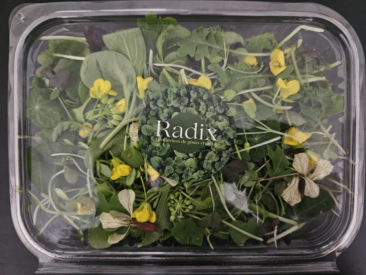 Notre mesclun n'est pas un mesclun comme les autres ! Mélange de nos micro-pousses, vous trouverez dans votre mesclun une explosion de saveurs : bourrache, celeri, capucine, cerfeuil, shungiku, basilic, amaranthe, moutarde, roquette, shiso ... et pétales de fleurs. Autant de couleurs et de saveurs pour transformer tous vos plats en délices de chefs !