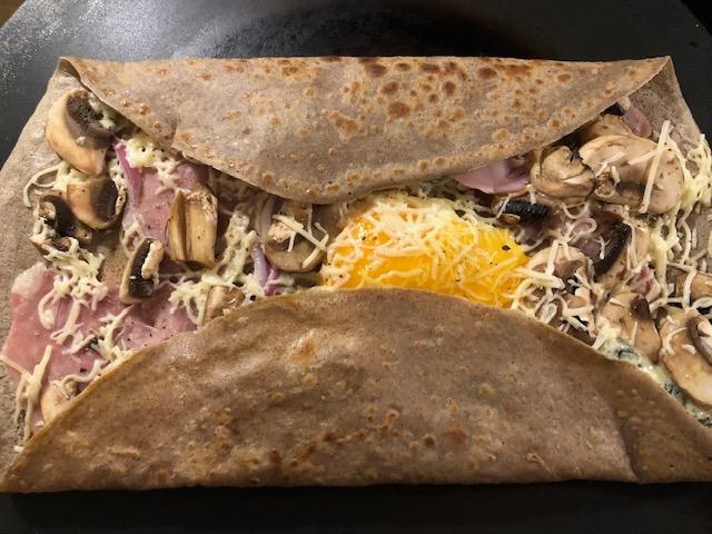 Ingrédients : galette de blé noir, jambon blanc, œuf, gruyère, champignons