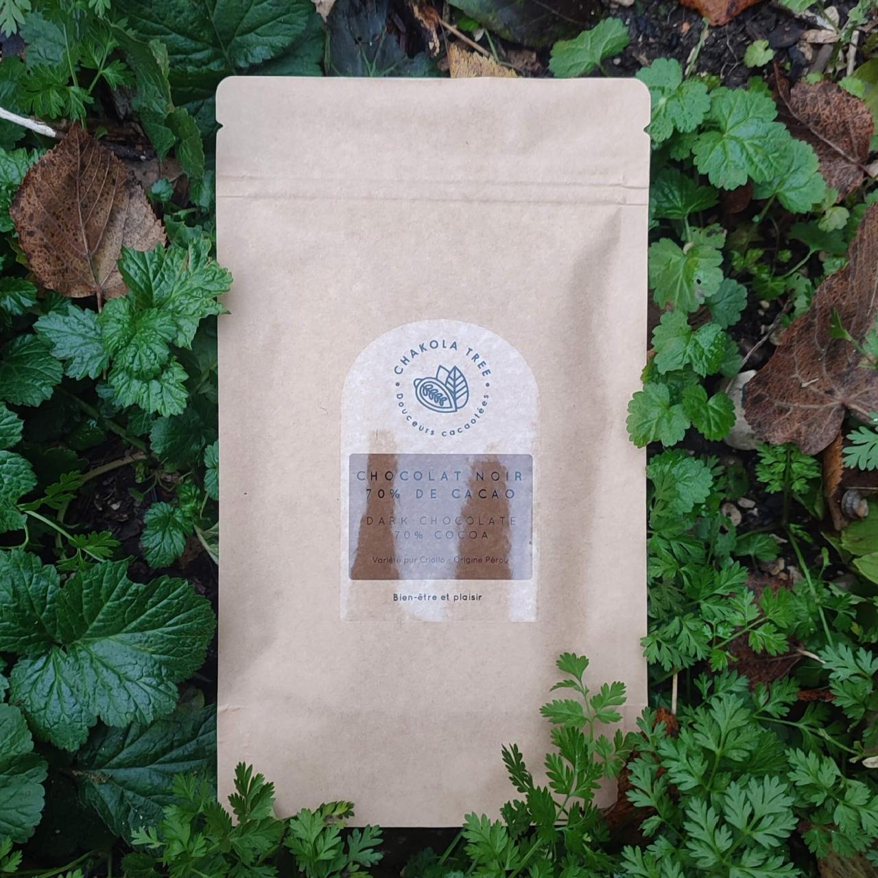 Ingrédients : chocolat noir 70% de cacao (fèves de cacao*, sucre de canne complet, beurre de cacao).