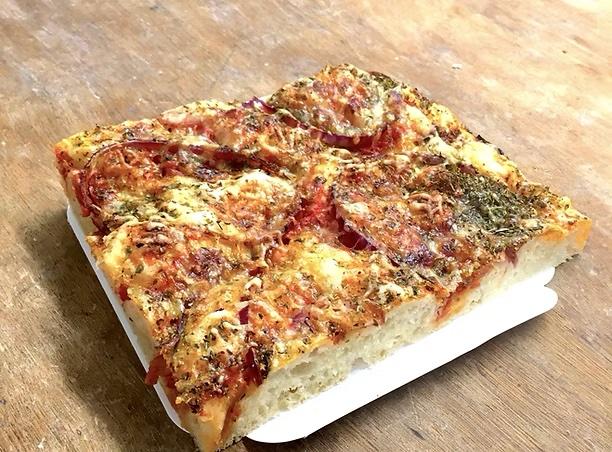 Pâte moelleuse à l'huile d'olive garnie de sauce tomate, d'oignons rouges, de tranches de chorizo et gratinée à l'emmental
