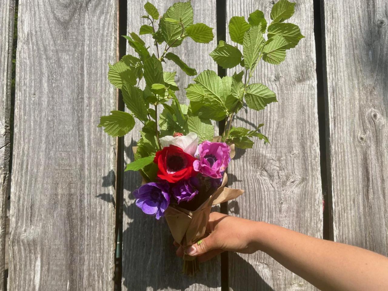 Nous proposons des bottes d’anémones, une petite dizaine de tiges en mélange. Nous ajoutons un peu de feuillage du moment comme sur la photo avec du noisetier.