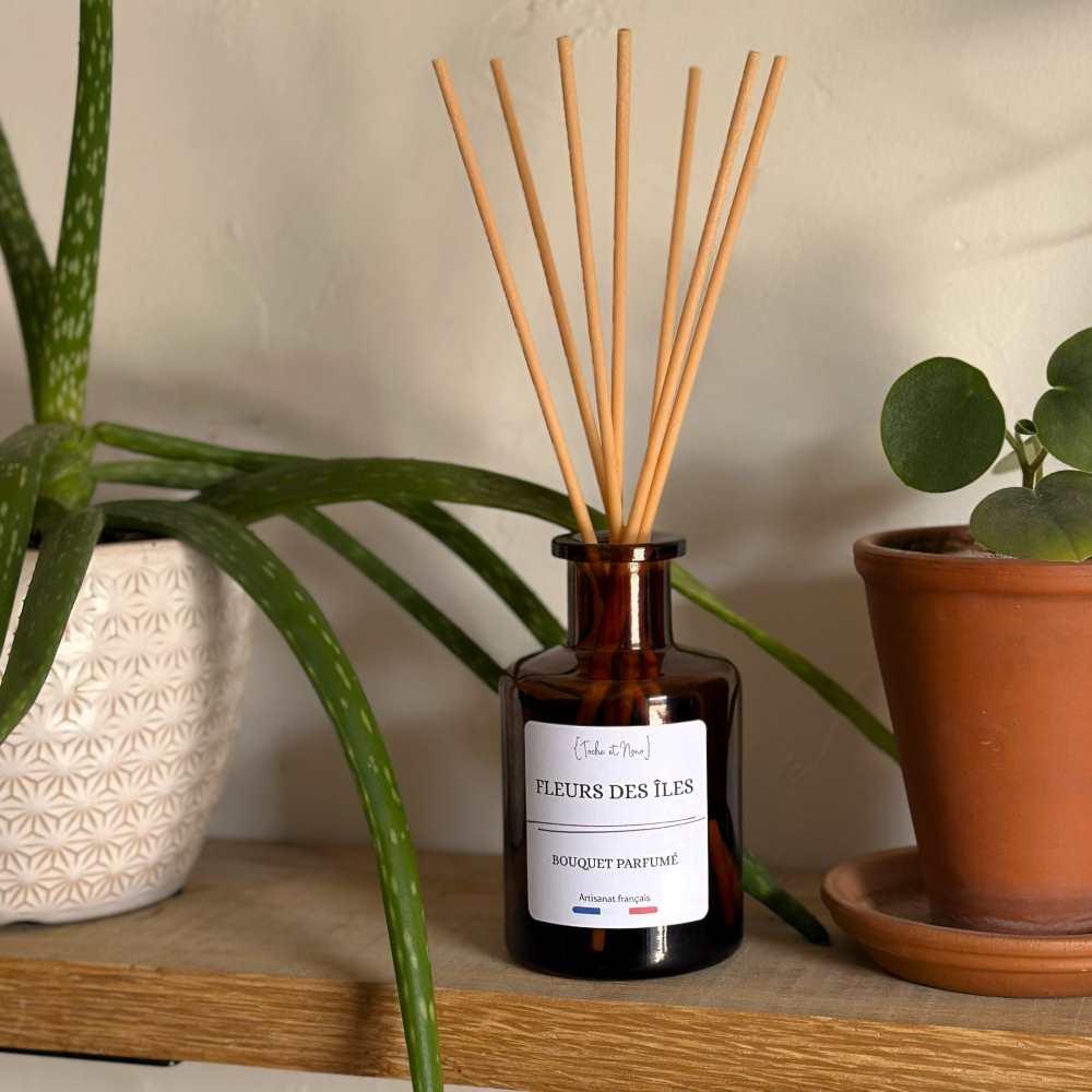 Ingrédients : Le bouquet parfumé Fleurs des îles se présente dans un flacon en verre ambré au charme vintage. Élégant et intemporel, il trouve facilement sa place dans tous les intérieurs, du salon à la chambre, en passant par la salle de bain. Le flacon est accompagné de 8 tiges en fibres naturelles, qui assurent une diffusion continue et homogène du parfum.