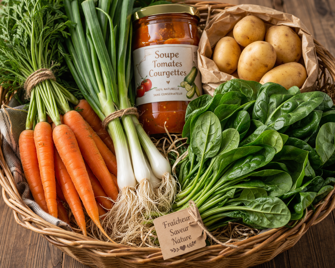 Ce panier de taille moyenne rassemble un assortiment varié et coloré de légumes bio, cultivés avec passion et savoir-faire par Soli-Bio. Chaque récolte vous apporte le meilleur de la nature, du champ jusqu’à votre table. Fraîcheur, diversité et qualité s’unissent pour sublimer vos repas, sains et savoureux, tout au long de l’année.