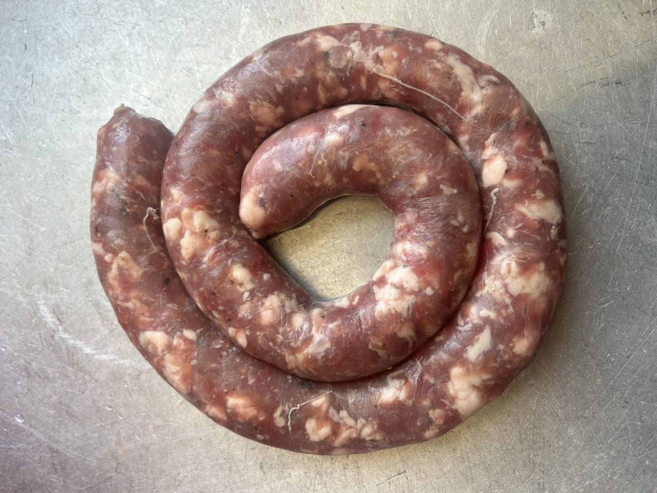 Saucisse de campagne Porc de Bayeux élevé en plein air entre 14 et 20 mois.