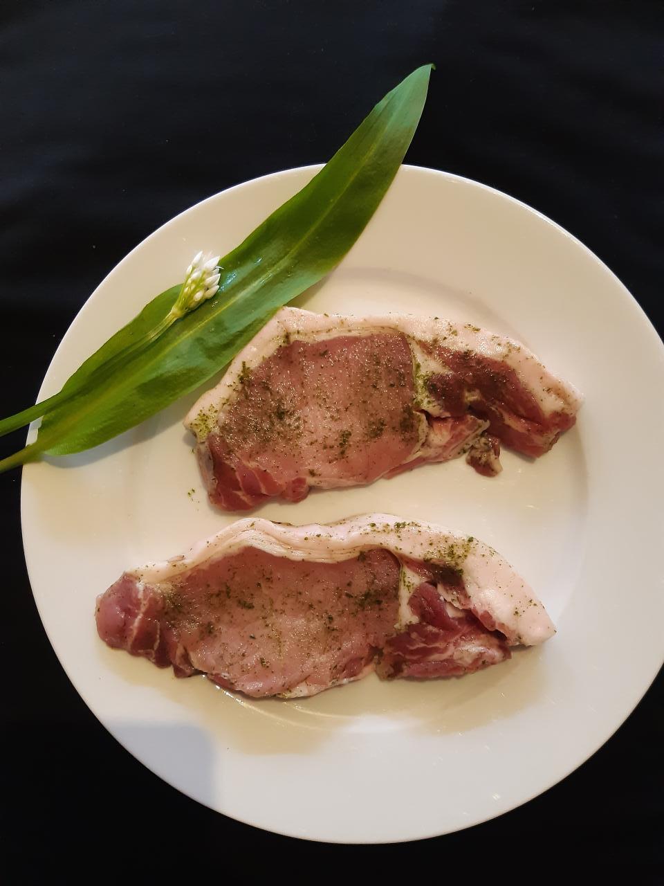 Pavé à l’ail des ours Porc de Bayeux. Un morceau prélevé dans le filet, très tendre et rapide à cuire : à la poêle, à la plancha ou en grillades.