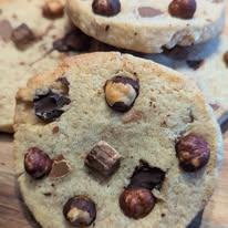 Cookies fait maison avec du beurre Breton, de la farine du moulin du Roudun à Poligné, du sucre origine France, du chocolat noir corsé 65% et des pistaches. Pointe de praliné