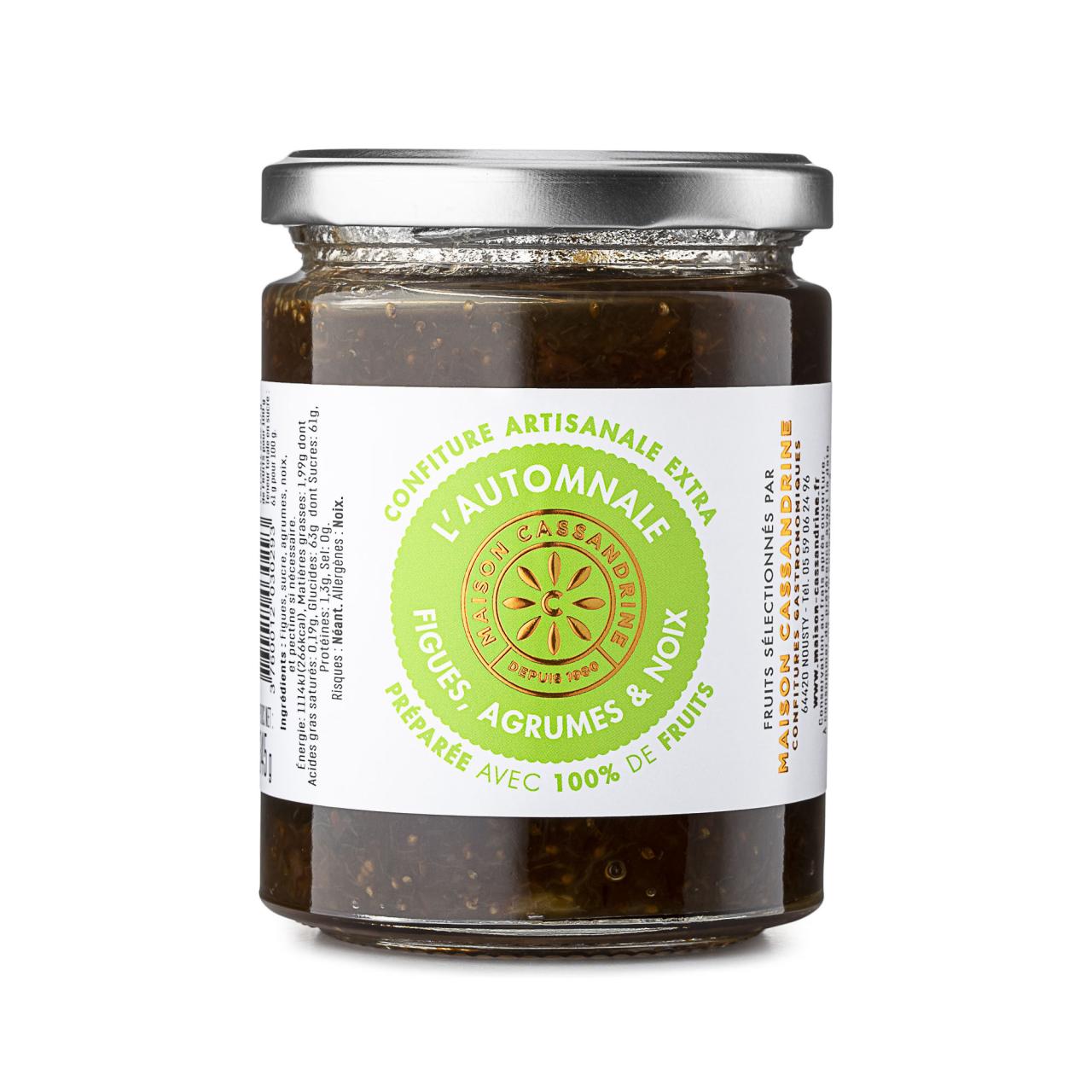 Allergènes : Noix Conditionnement : Pot en verre Durée de conservation : 60 mois Ingrédients : Figues, Agrumes, Noix, Sucre et Pectine si nécessaire.