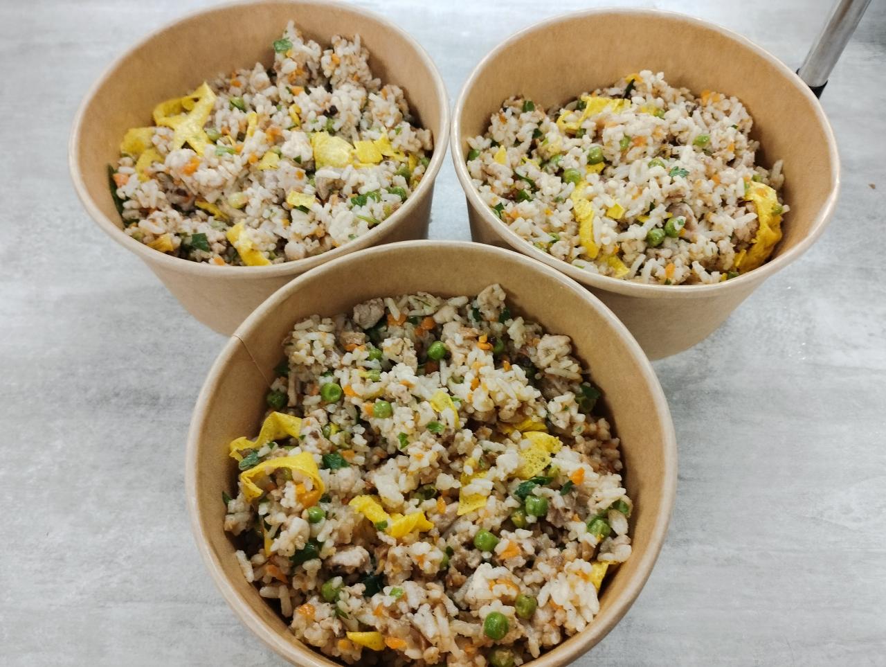 Sauté de riz avec viande, champignons et légumes constituant un plat complet, à emporter et à déguster froid ou mieux chaud.
