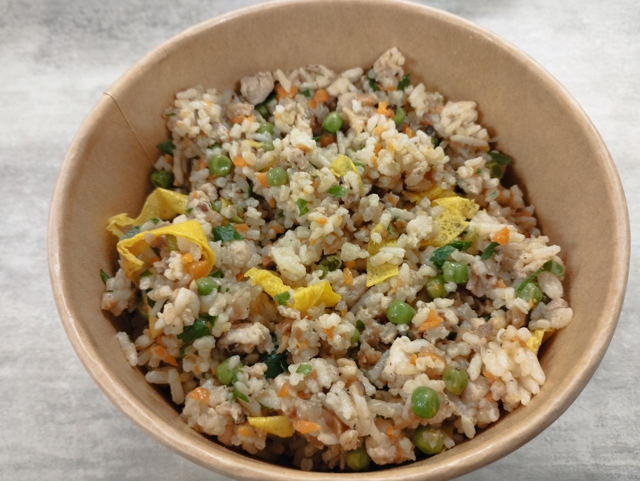 Ingrédients : Riz, omelette, poulet, shitake, petit pois, sel, poivre, carottes, sauce soja, curcuma.