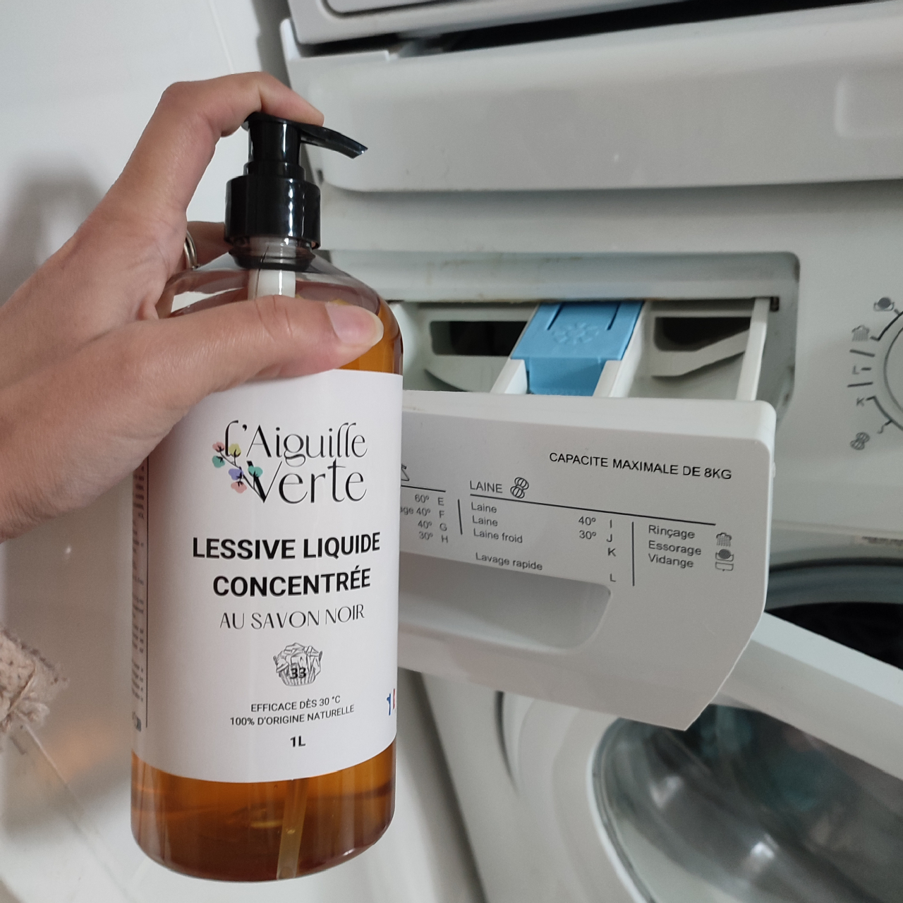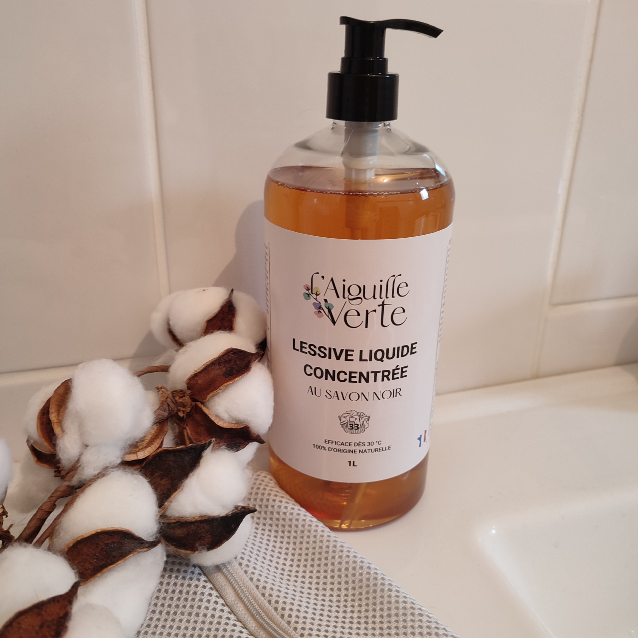 Lessive liquide concentrée au savon noir 100% végétal, efficace dès 30°C et pour tous types de linge (coton, synthétique, blanc, couleurs, tissus délicats et laine).