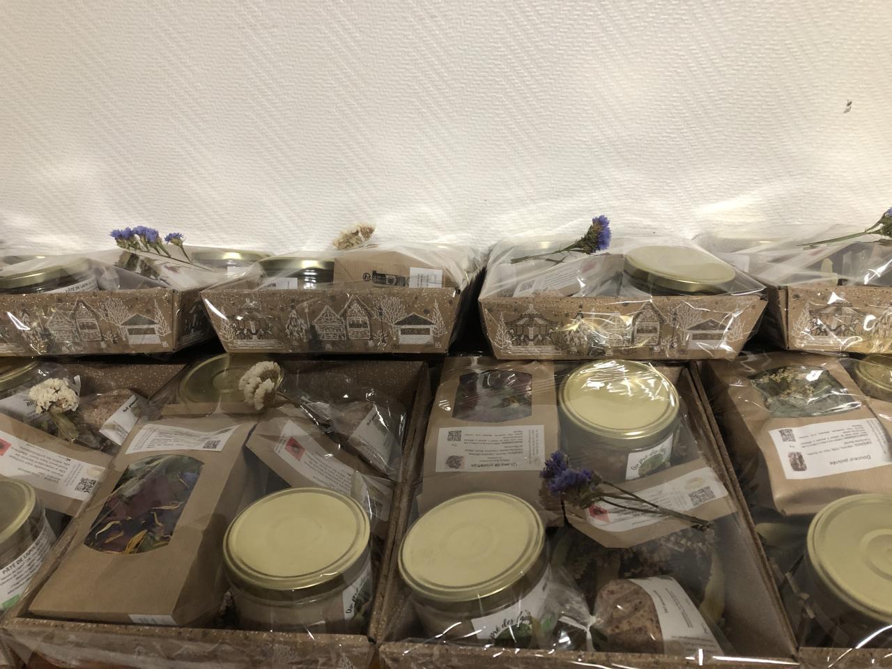 Panier diversifié de produits de la ferme. Il est composé de deux terrines de lapin bio, un sachet de tisane bio, un sel pimenté, un sachet de semences de coquelicot.