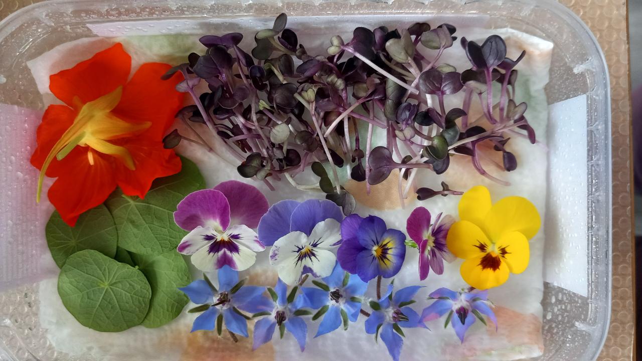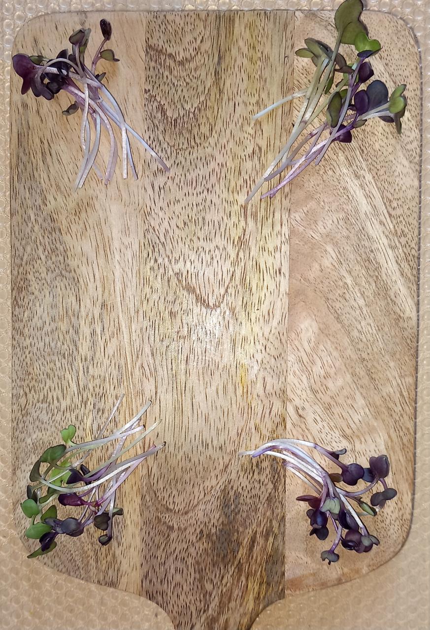 Votre kit contient une planche, une fiche et une boîte fraicheur avec les micro pousses et les fleurs à conserver au réfrigérateur.
