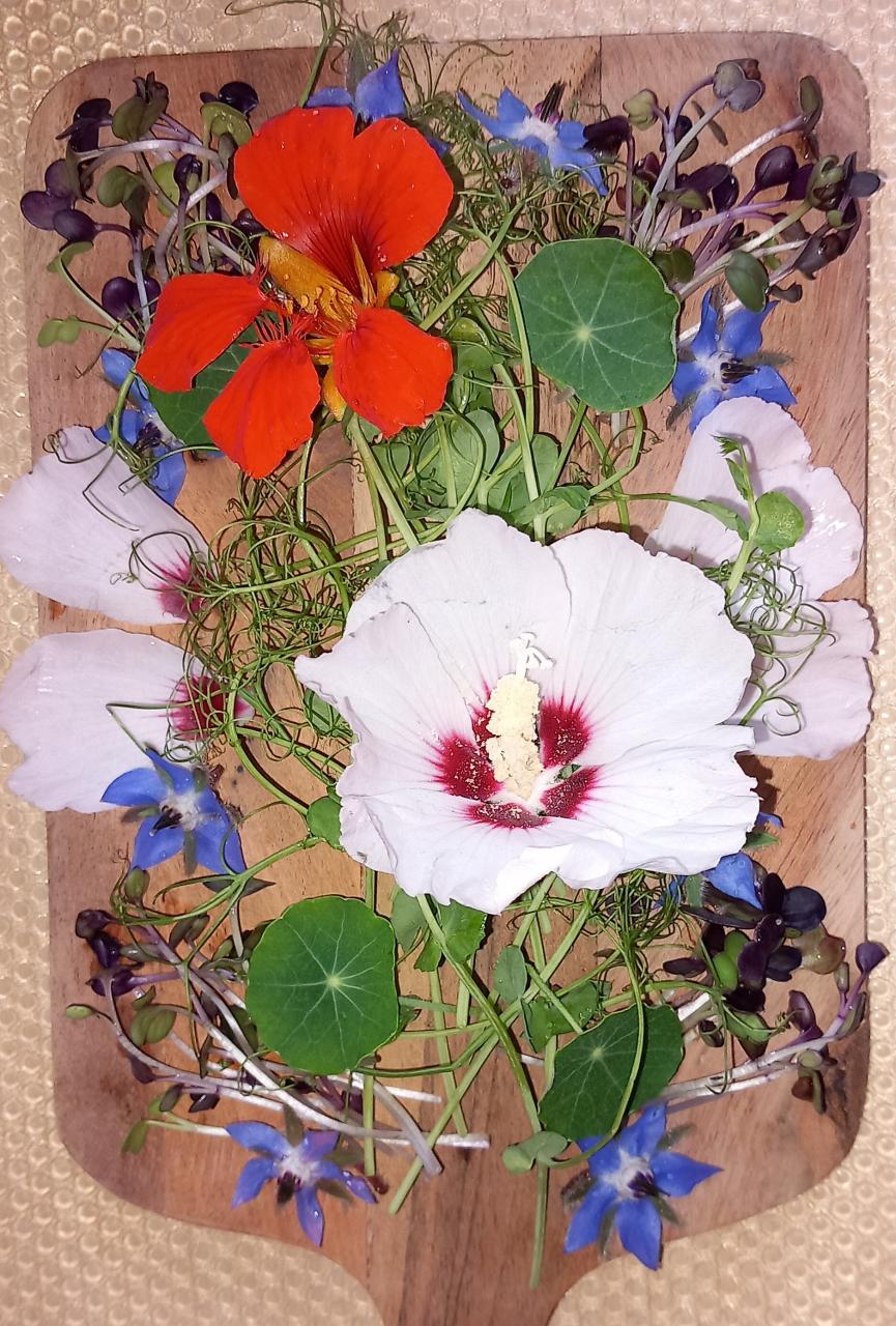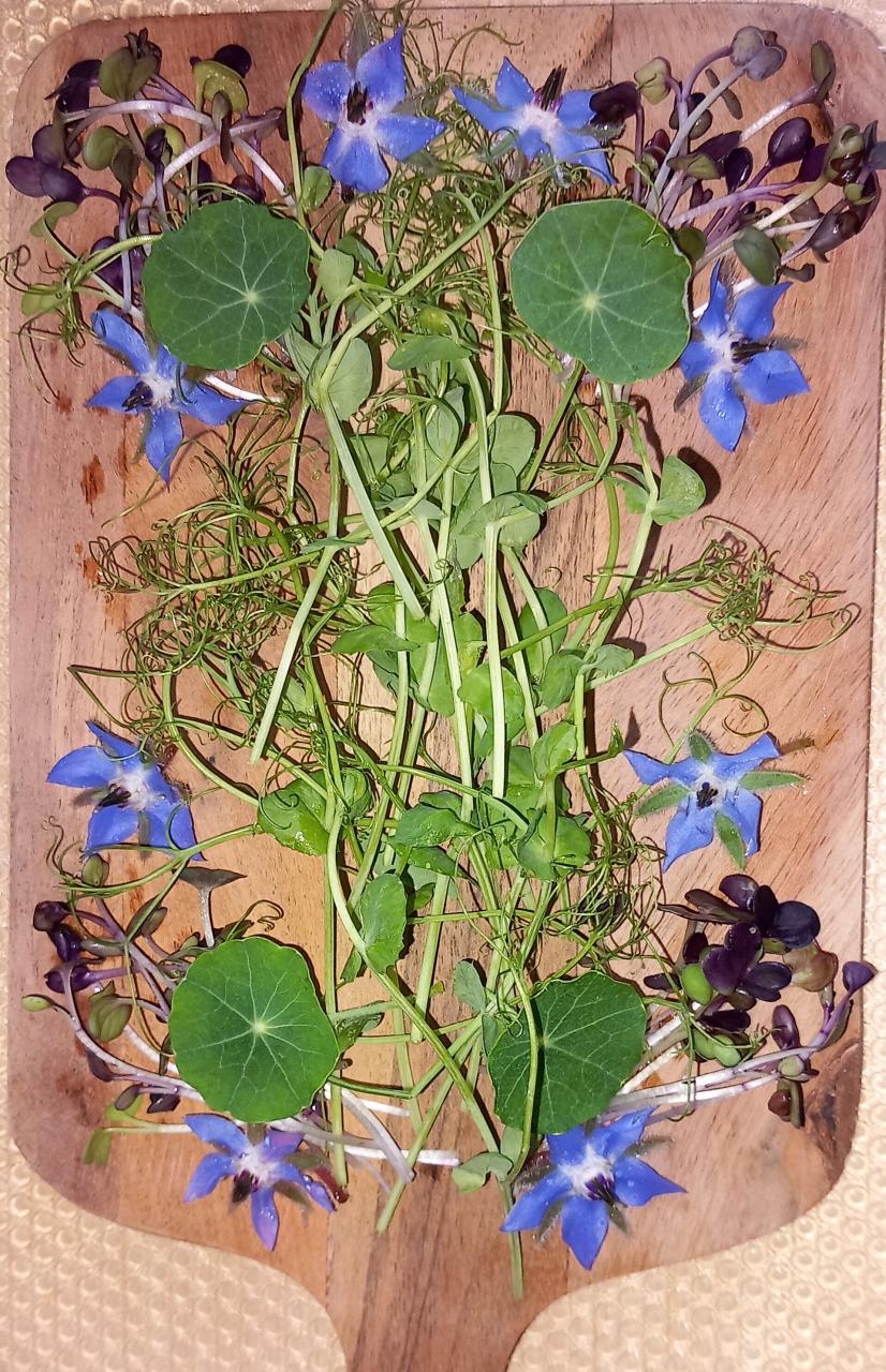 Elaborée à partir de micro pousses de légumes et de fleurs comestibles de saison, la planche évolue tout au long de l'année.