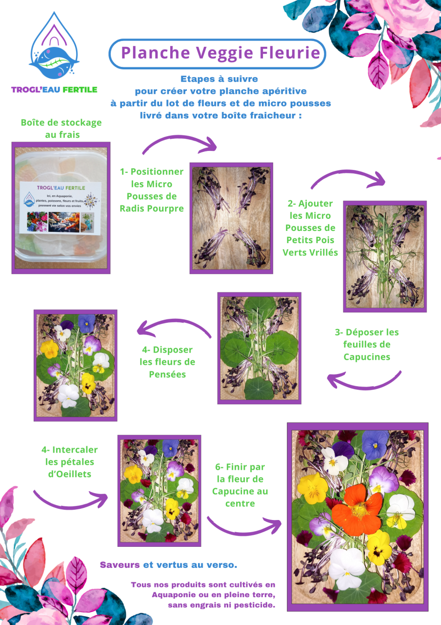 En plus du pas à pas qui va vous aider à dresser votre planche Veggie Fleurie, vous trouverez au verso de la fiche les différentes saveurs et vertus de chaque élément ainsi qu'un ordre conseillé de dégustation.