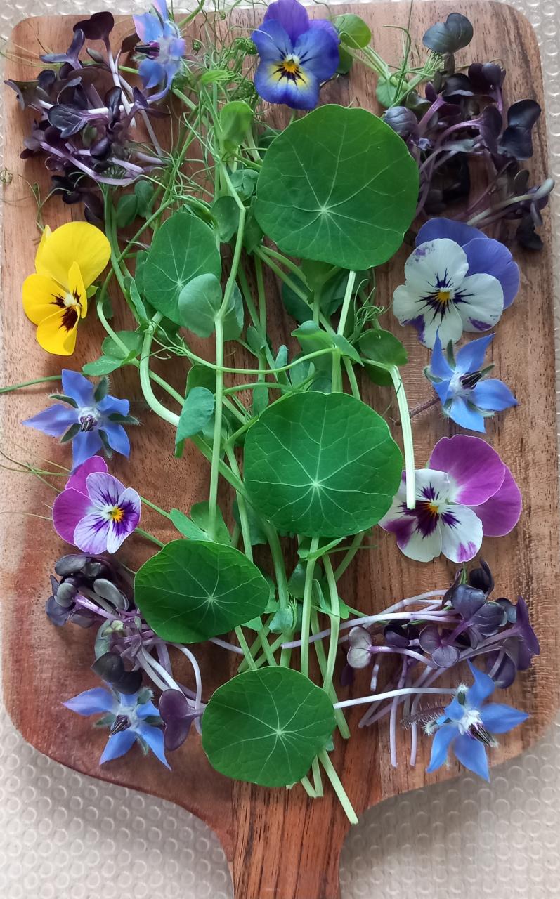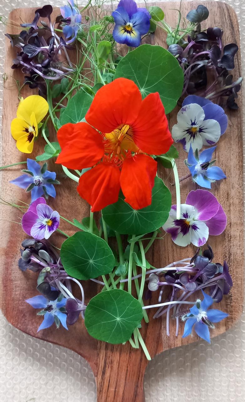 Elaborée à partir de micro pousses de légumes et de fleurs comestibles de saison, la planche évolue tout au long de l'année.