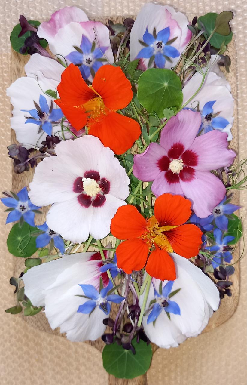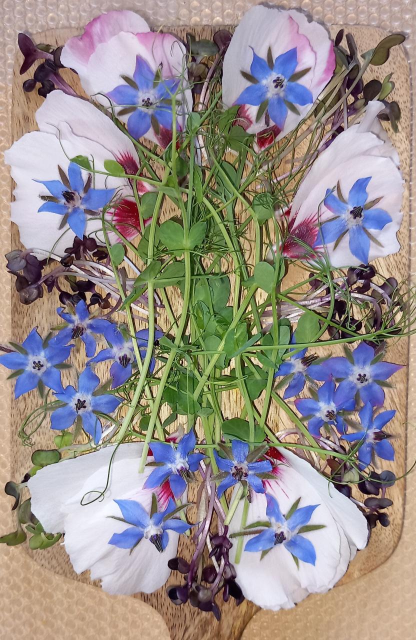 Elaborée à partir de micro pousses de légumes et de fleurs comestibles de saison, la planche évolue tout au long de l'année.