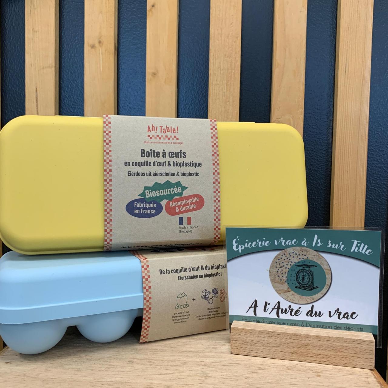 Réutilisable, lavable, durable et 100% recyclable, cette boîte à œufs est composée de coquille d'œuf récupéré et de bioplastique fabriqué à partir d'huile végétale recyclée (économie circulaire).