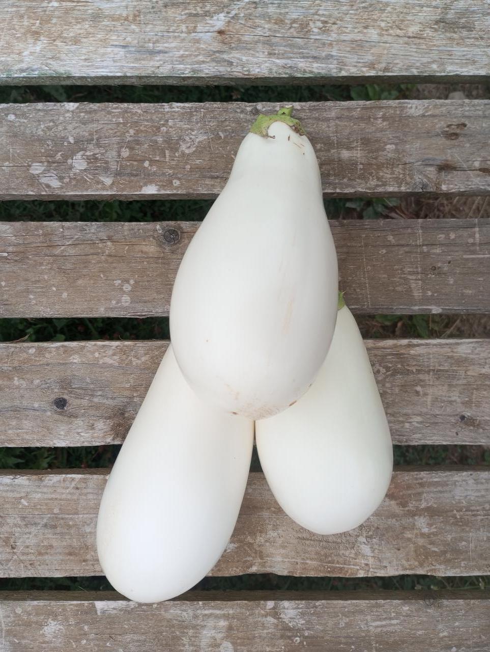 Aubergine blanche léger goût de champignon, texture spongieuse crue très fondante une fois cuite. Se cuisine en ratatouille mais également rôti au four...
